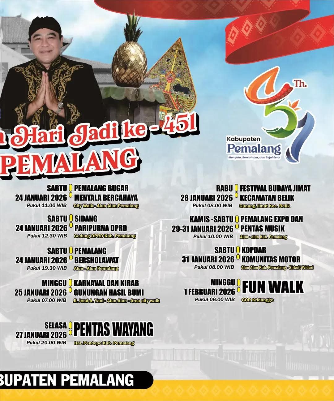PEMALANG, mediakita.co- Kabupaten Pemalang pada tahun 2026 ini merayakan Hari Ulang Tahun (HUT) yang ke-451 tahun.