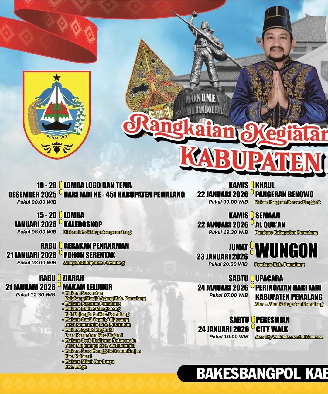 “Dalam rangkaian hari jadi ke-451 tahun ada beragam acara, rangkaiannya sudah dimulai sejak pada bulan Desember 2025 yang lalu dari lomba logo dan tema,” kata Joko Ngatmo, Kepala Bakesbangpol Pemalang, Senin (19/1/2026).